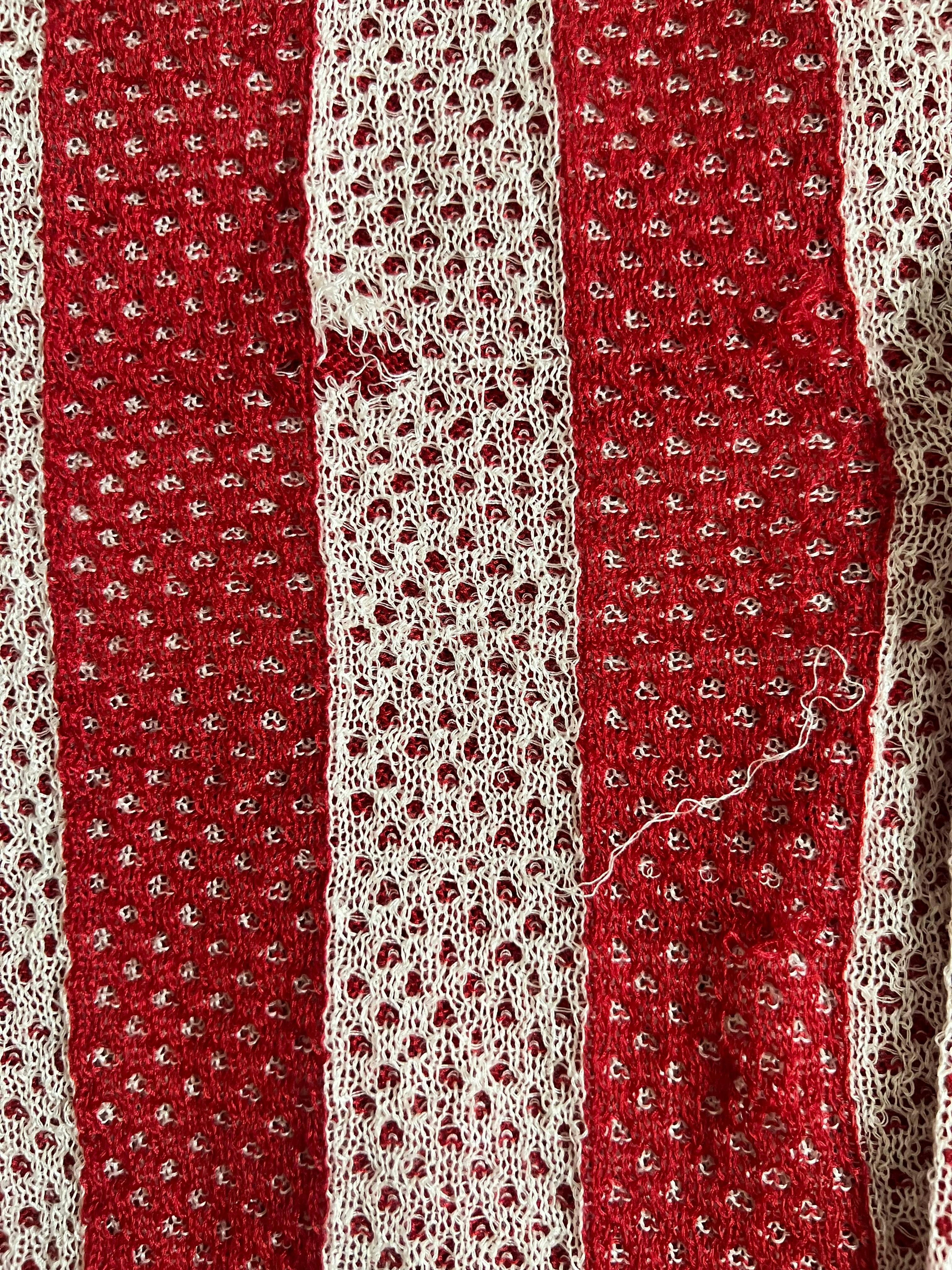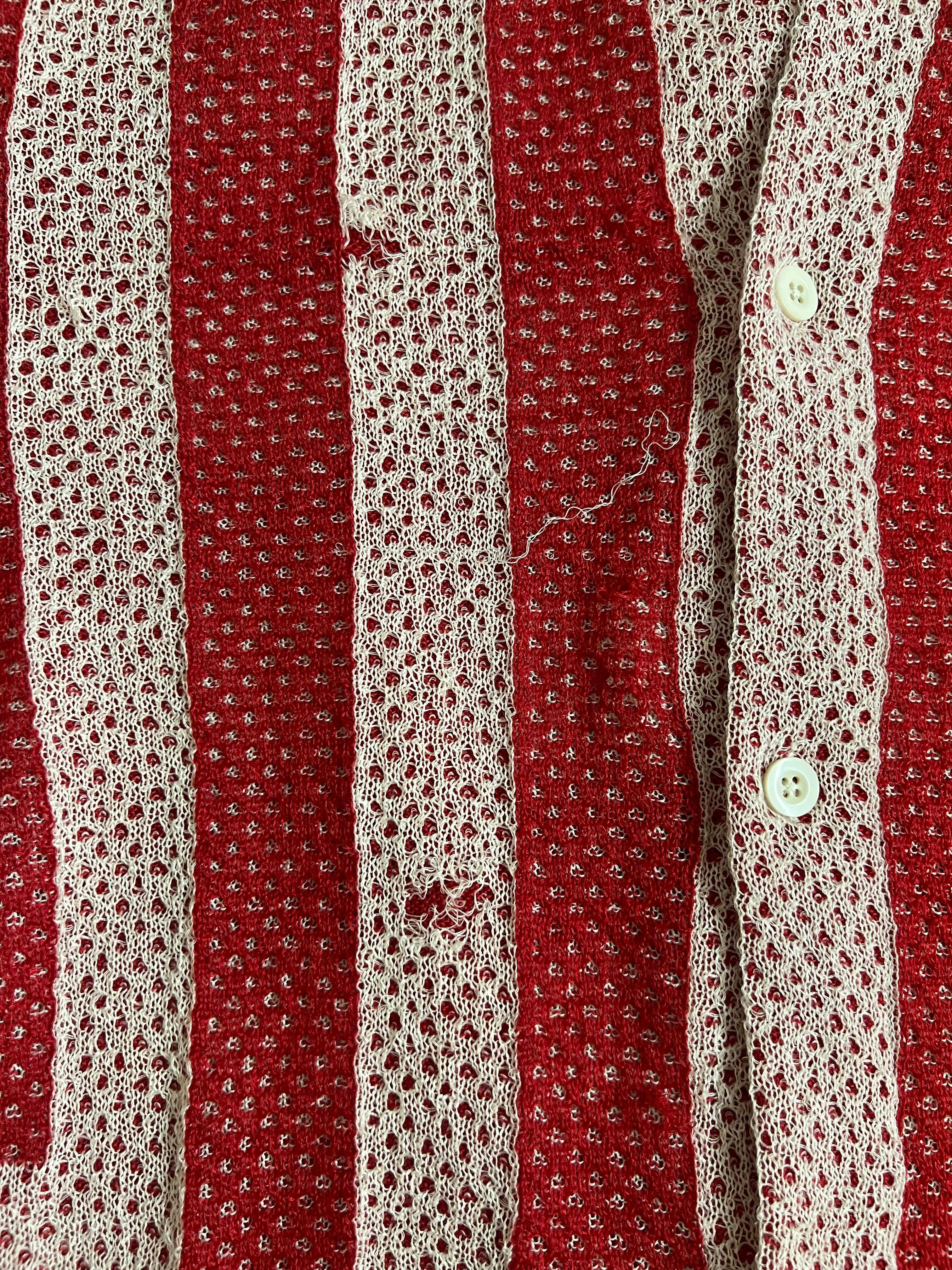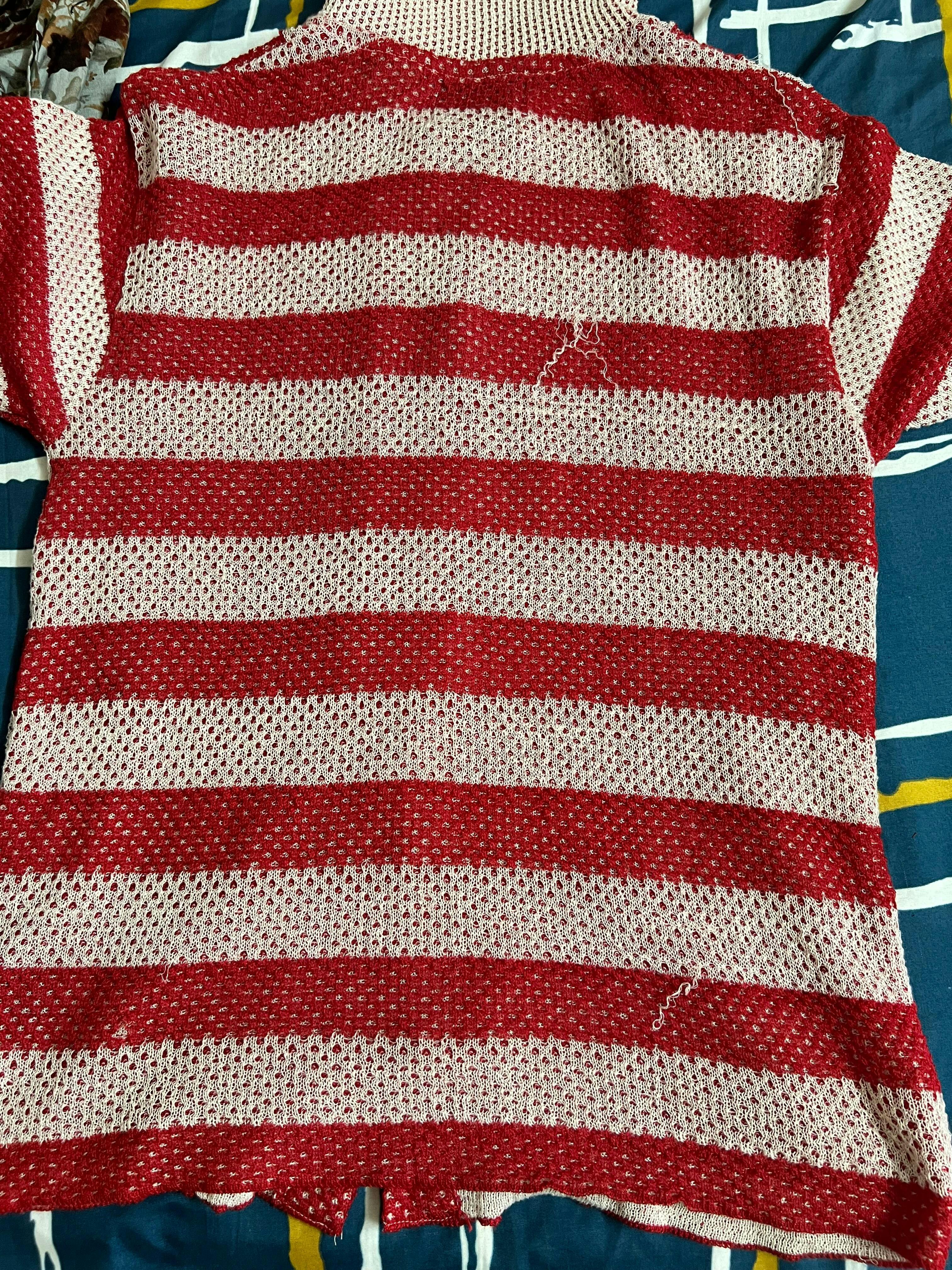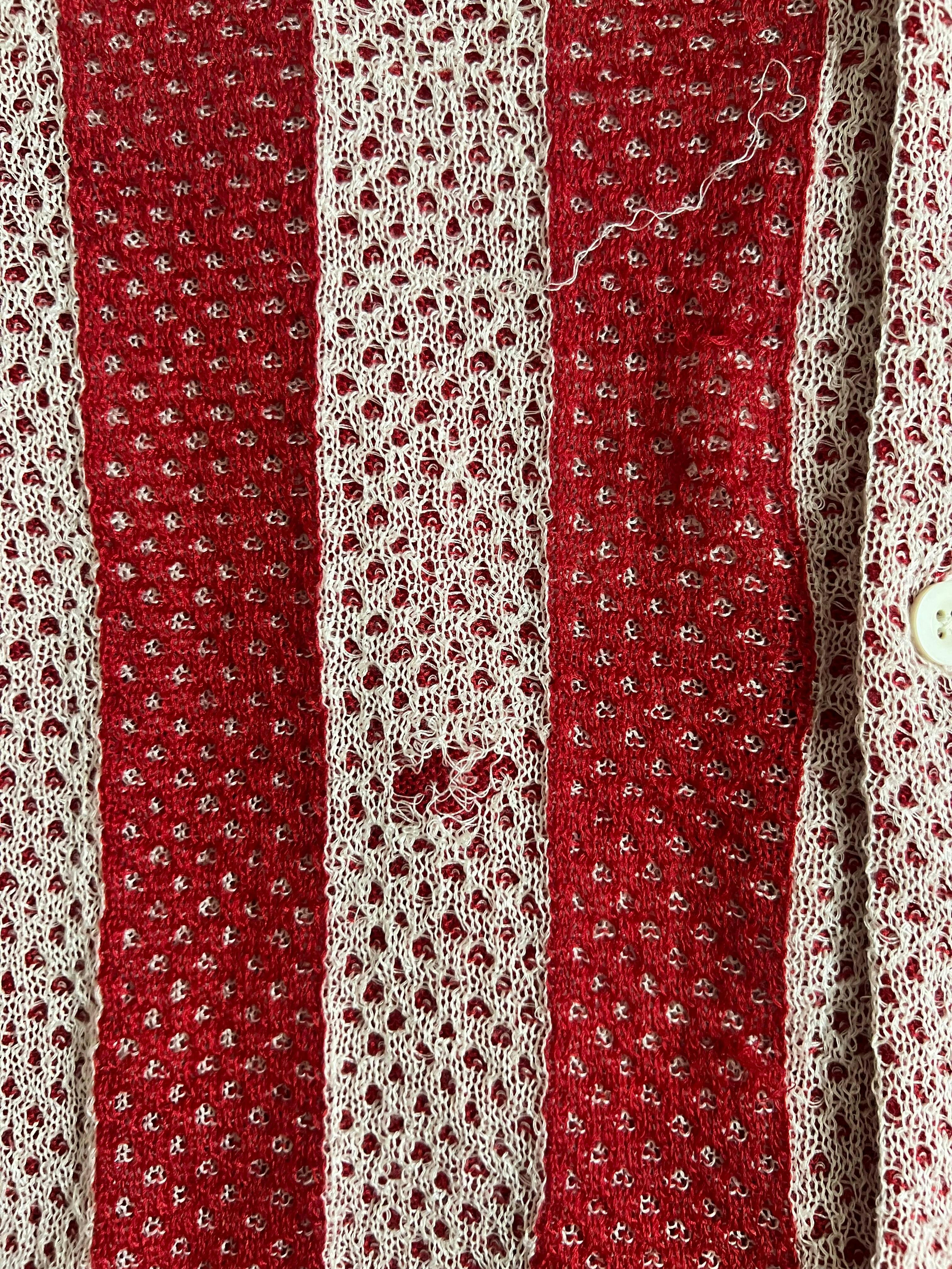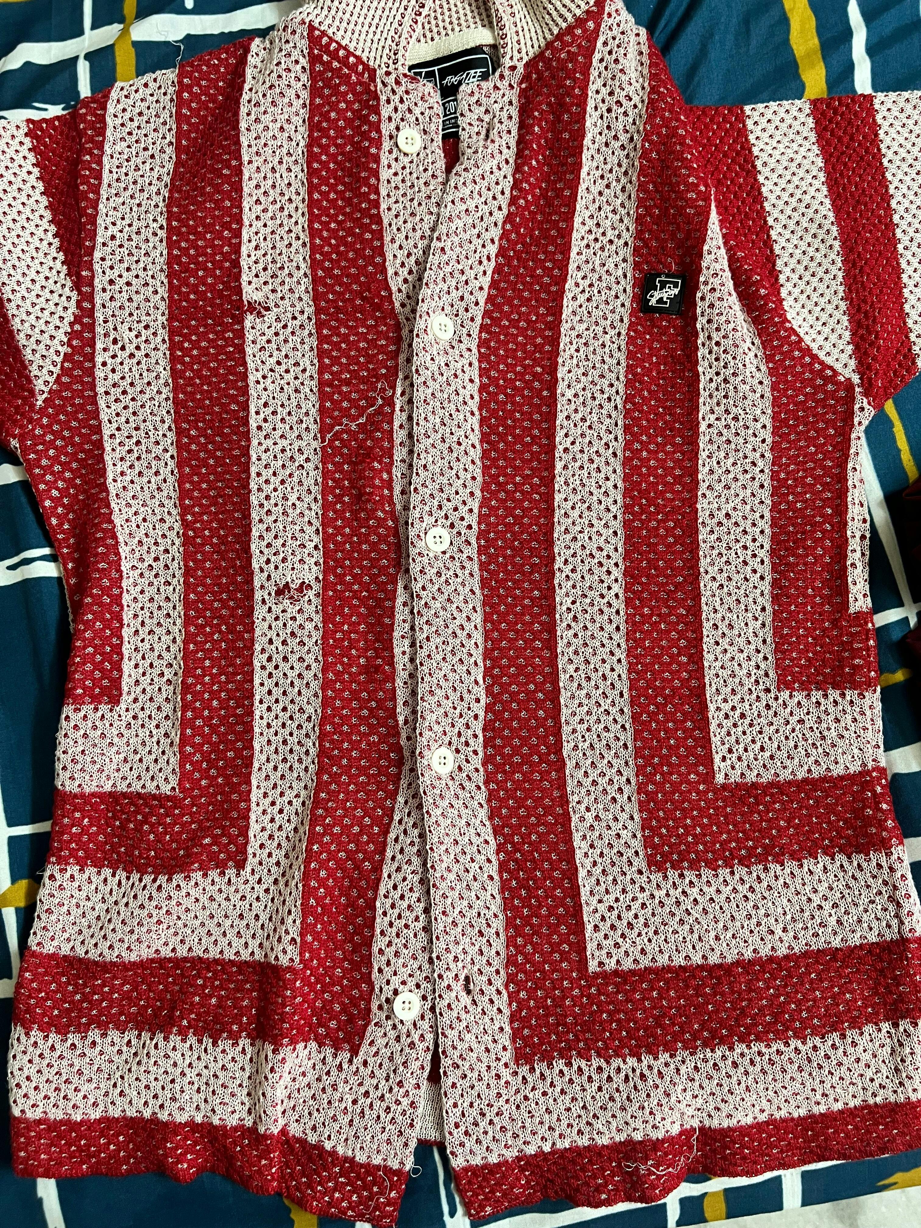 This stylish shirt, known as the Red Striped Crotchet Knitted Shirt, is made of a fabric blend containing 80% cotton and 20% polyester. Its design features a classic polo collar, buttoned Placket, and short sleeves. It has a loose fit and a unique abstract allover design, with ribbed sleeve openings and a ribbed hemline. The shirt also boasts a band logo and a striking silicon patch.
