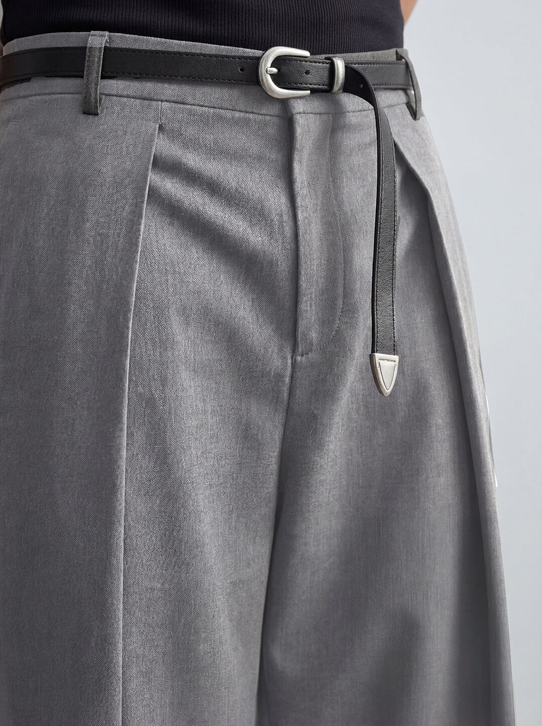 The Grey Pleated Tailored Trousers feature deep front pleats and a relaxed wide-leg silhouette that falls clean from waist to hem. Crafted from a smooth, weight-balanced fabric, they offer structure without stiffness—designed to hold shape while moving naturally. Sharp, composed, and easy to style.