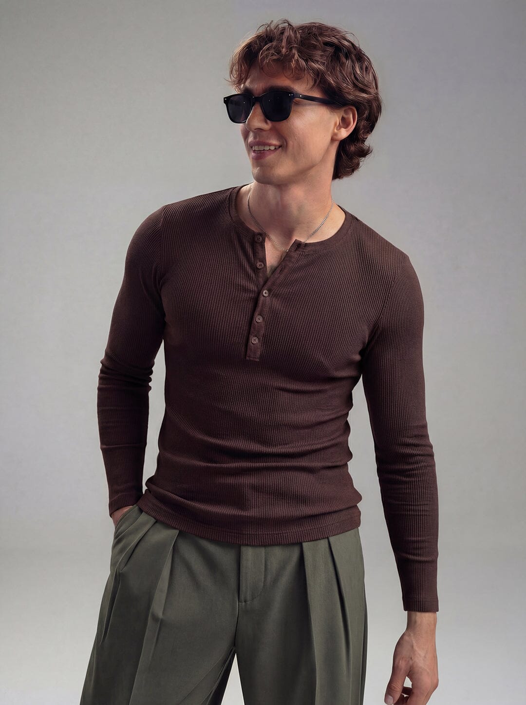 - Product Name: Coffee Ribbed Henley Longsleeves Tshirt