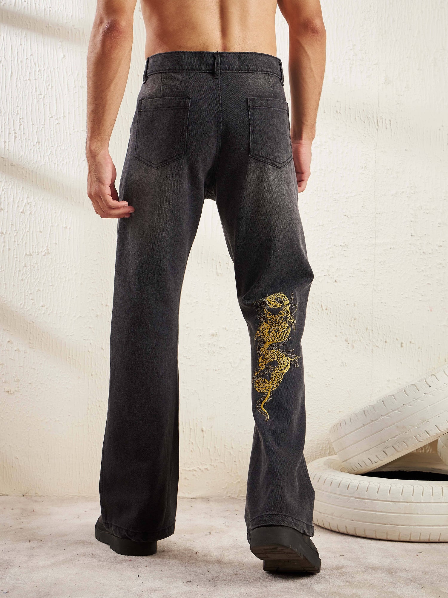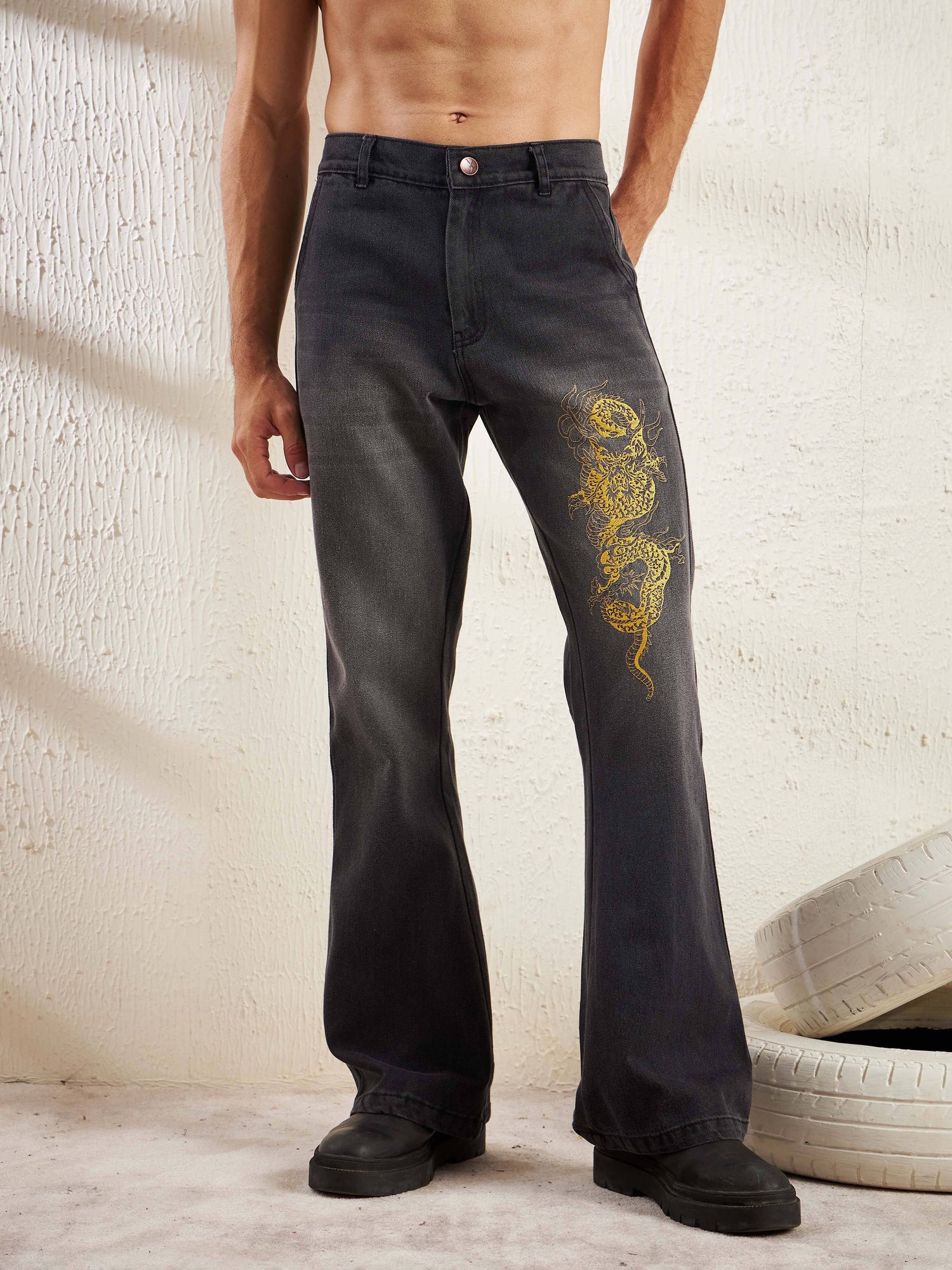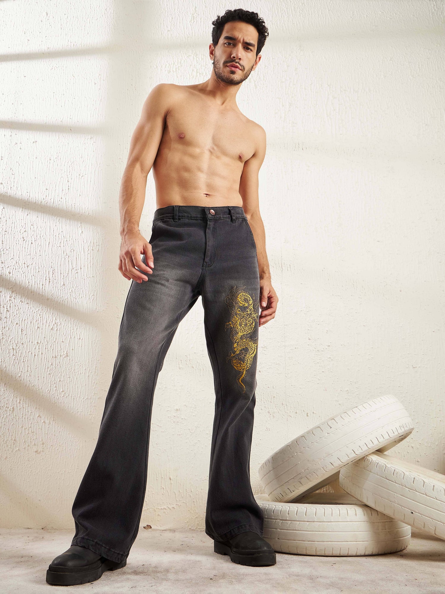 Constructed from black cotton denim, the Black Dragon Embroidery Flared Denim features a wide-legged fit, a zipped and buttoned fly, and belt loops. Boasting dragon embroidery on both the front and back, these jeans offer a wide leg opening for a smart silhouette.