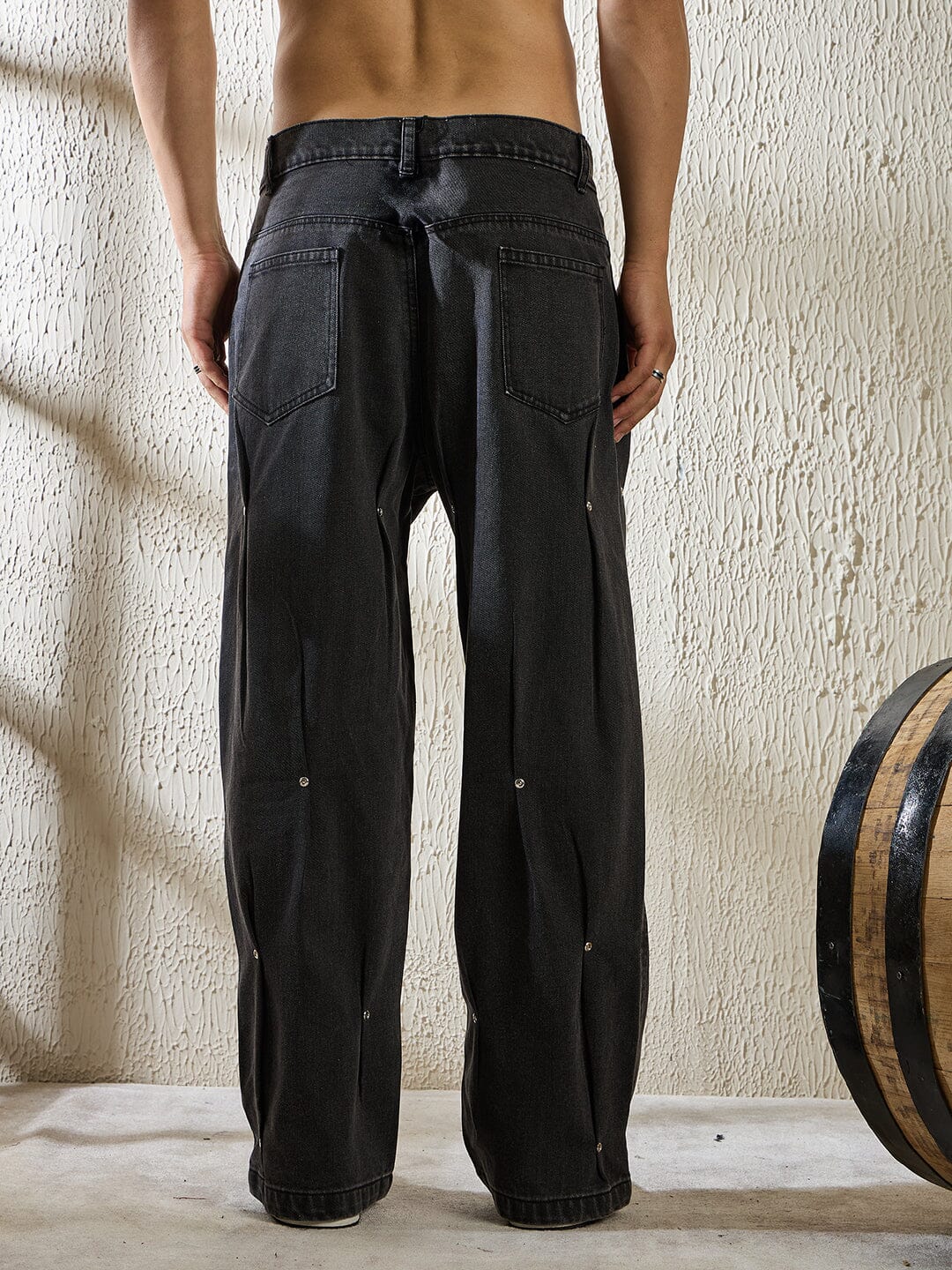 The Black Pleated Rivet Denim is made of 100% cotton fabric and features an acid washed finish, buttoned closure with belted loops, front and back pockets, and a baggy fit. The Allover Pleated Rivet Detail adds a touch of sophistication to this impressive garment.