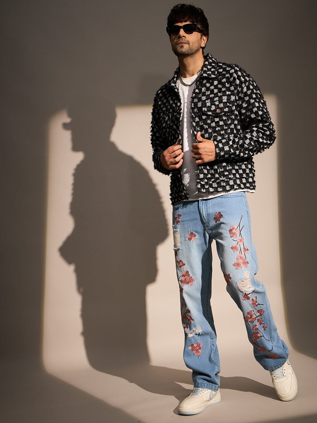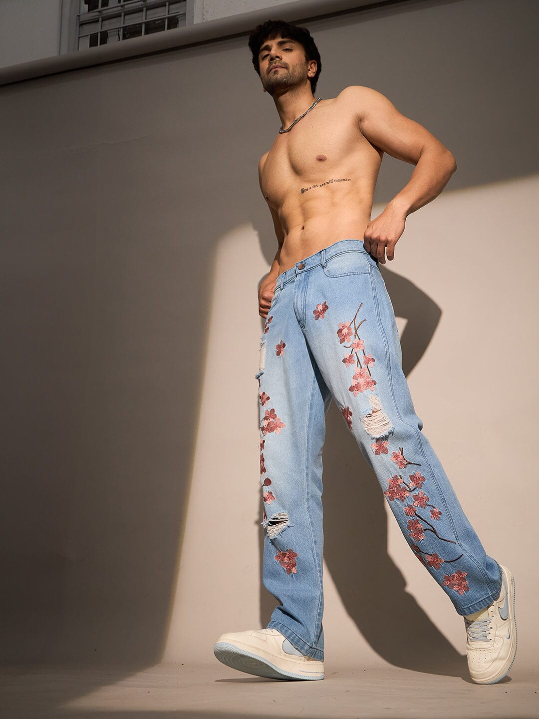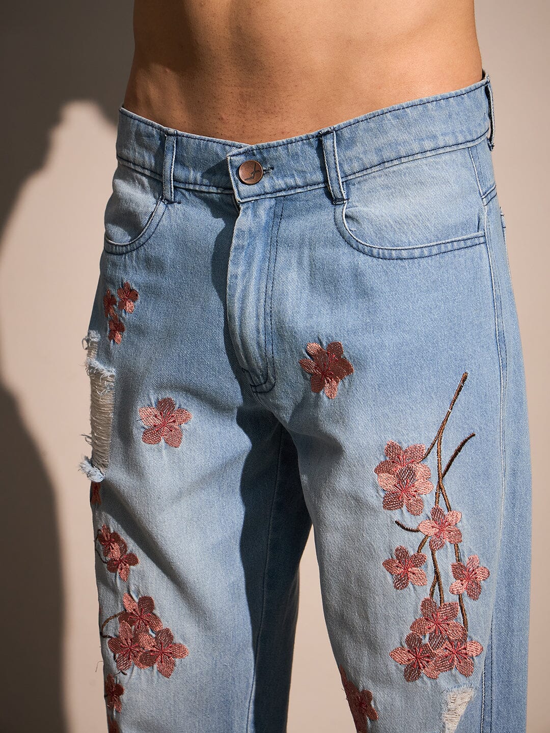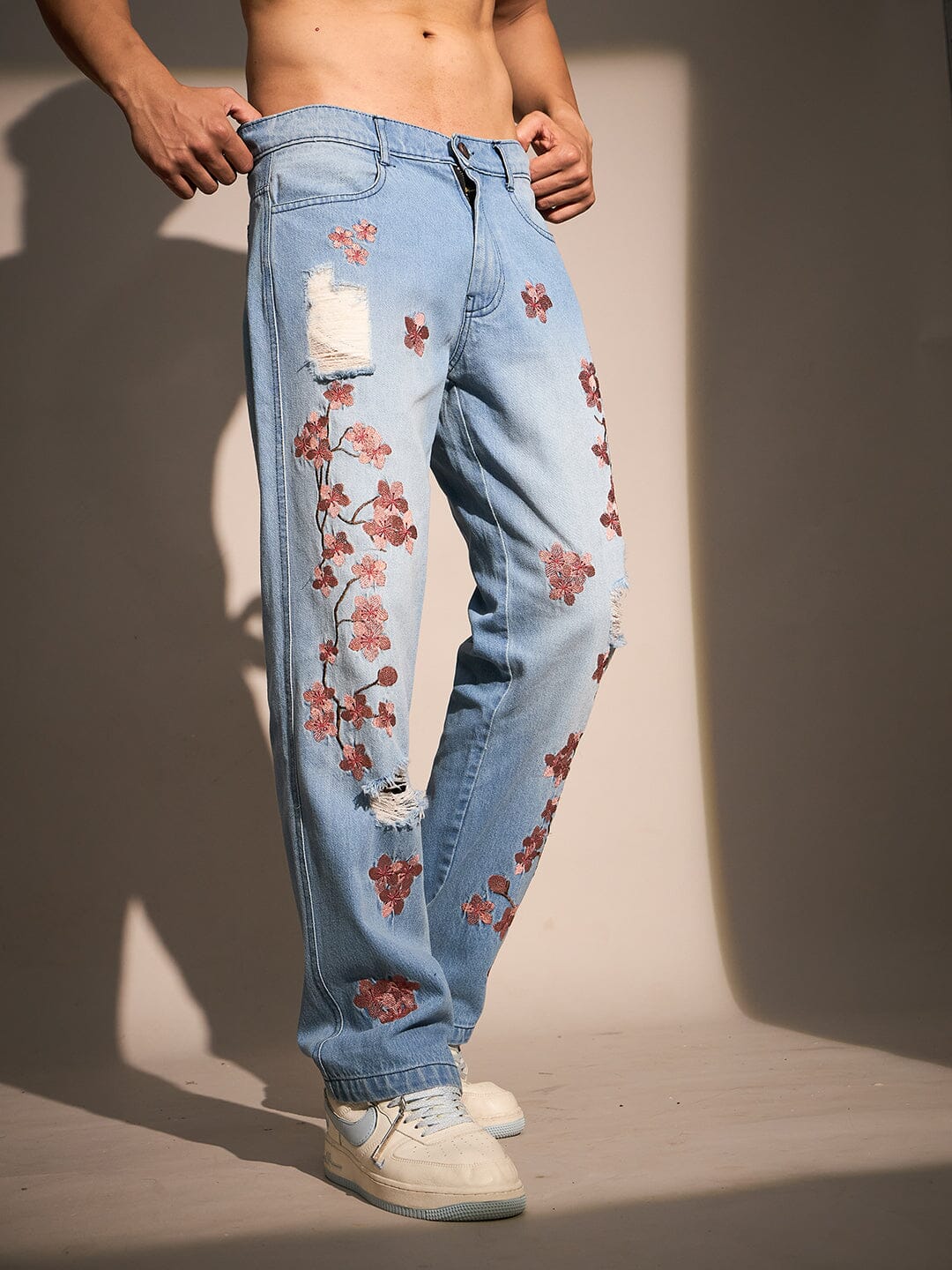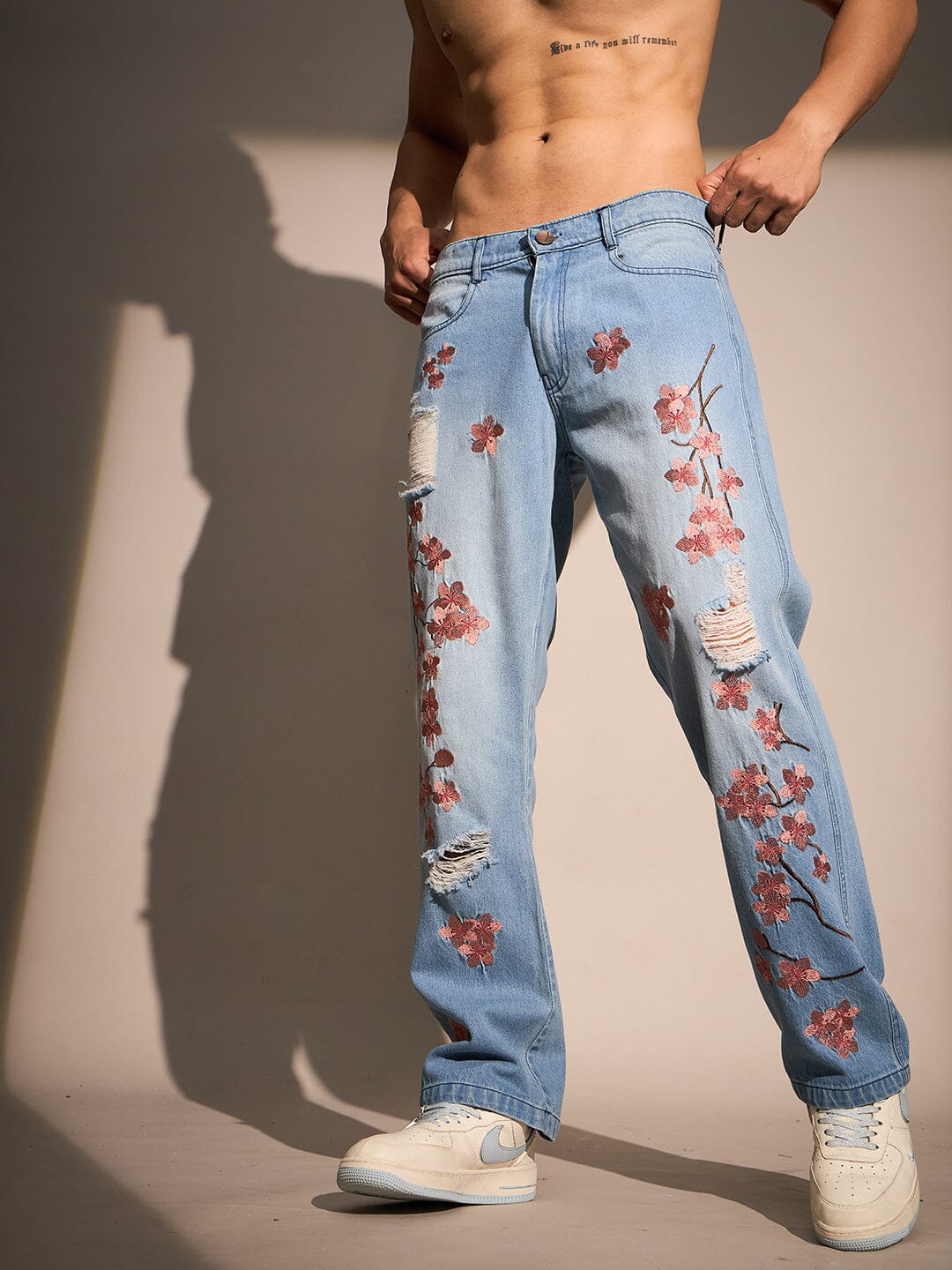 Introducing Ice Tint Cherry Blossom Straight Fit Denim - a high-quality product made from 100% cotton denim fabric. With its straight, baggy fit and four pockets, these jeans offer both comfort and practicality. The cherry blossom embroidery on the front adds a touch of elegance, while the faded effect gives a unique and stylish look. Easily fasten with the front zip fly and button closure. Perfect for those looking for a sophisticated and fashionable denim option.