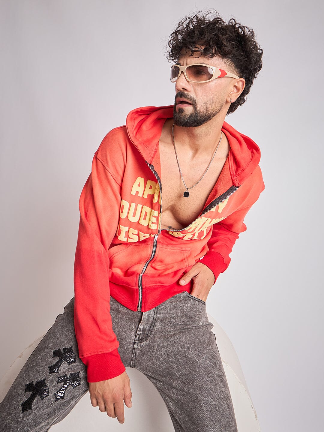 - Product Name: Red Washed Graphic Zipped Hooded Sweatshirt
