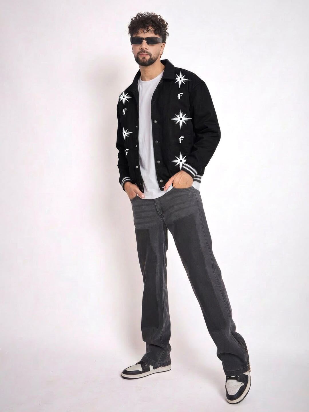 Introducing the Black Twill Applique Bomber Jacket - expertly crafted with heavy weight cotton twill fabric and a comfortable lining. Complete with a spread collar, snap button closure, and embroidered applique work, this jacket offers a relaxed fit and ribbed cuff and hemline. The perfect blend of style and functionality.