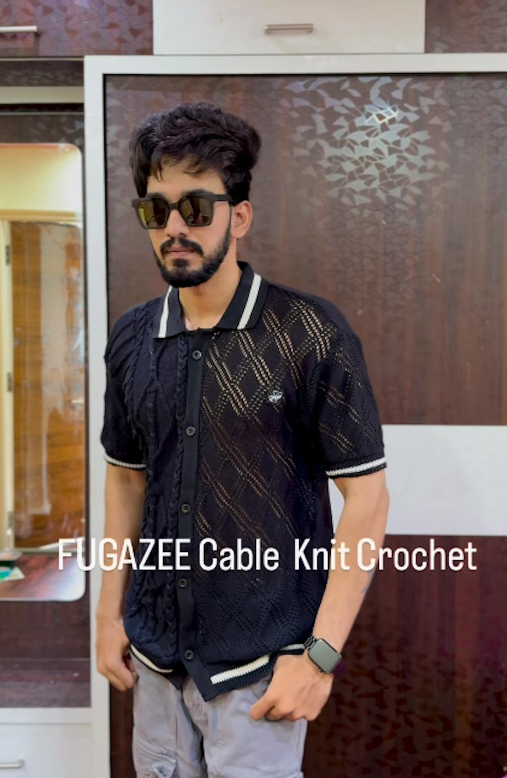 This Black Cable Knit Crochet Shirt features a fabric blend of 80% cotton and 20% polyester, a classic polo collar, a buttoned placket, and short sleeves. With a loose fit, abstract allover design, and ribbed sleeve opening and hemline, it also includes a band logo silicon patch for added style.