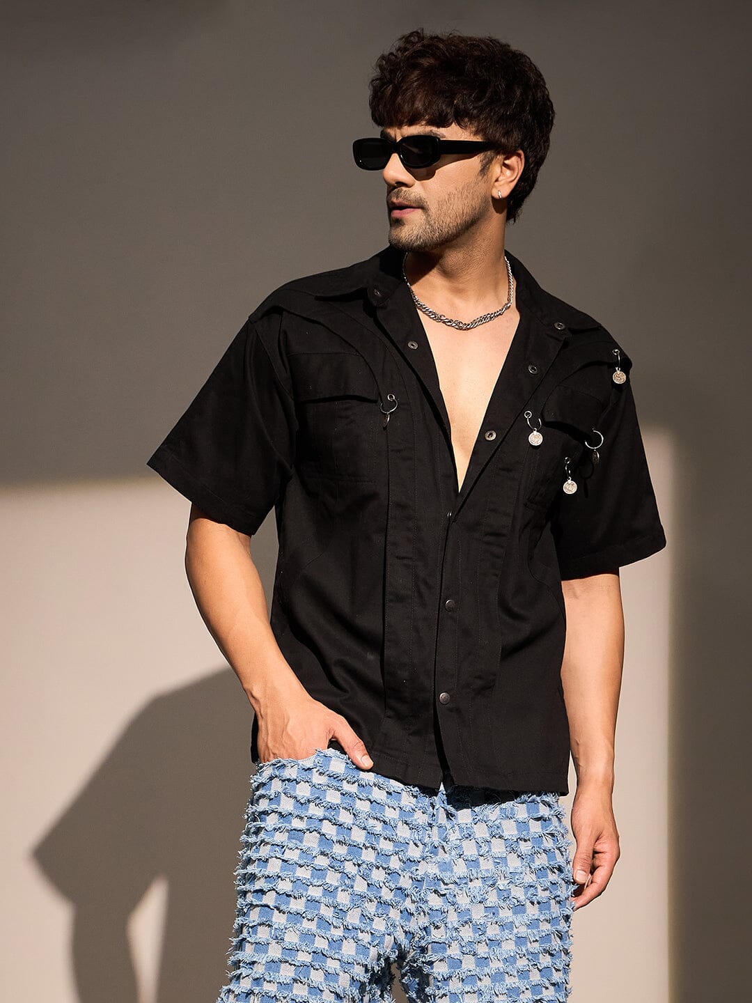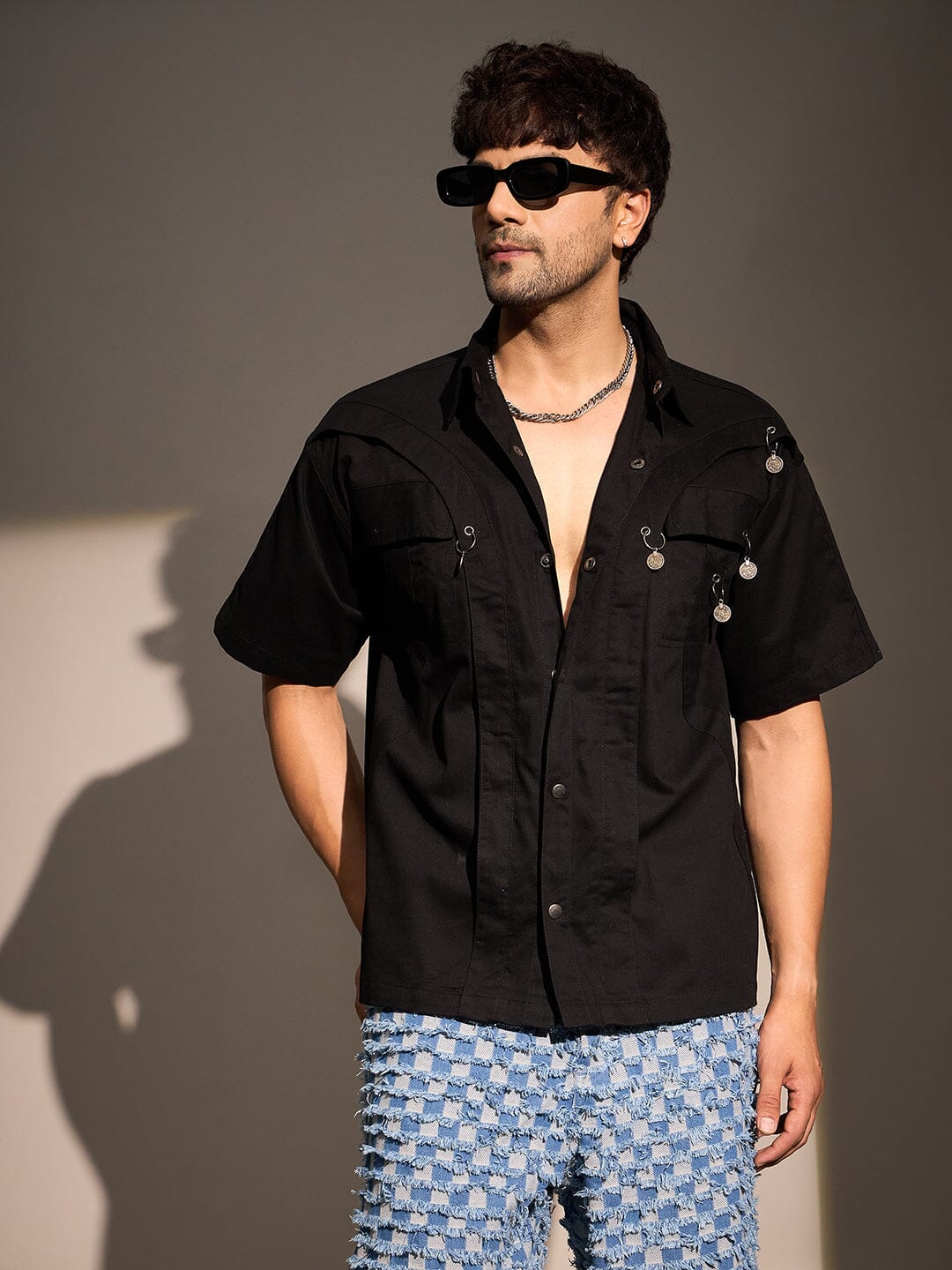 Constructed with Black Twill Shirting fabric, this shacket boasts a snap-buttoned closure, spread collar, cut and sew panels, and studded ring detail. The regular length and short sleeves add to its relaxed fit, making it a must-have for any wardrobe.