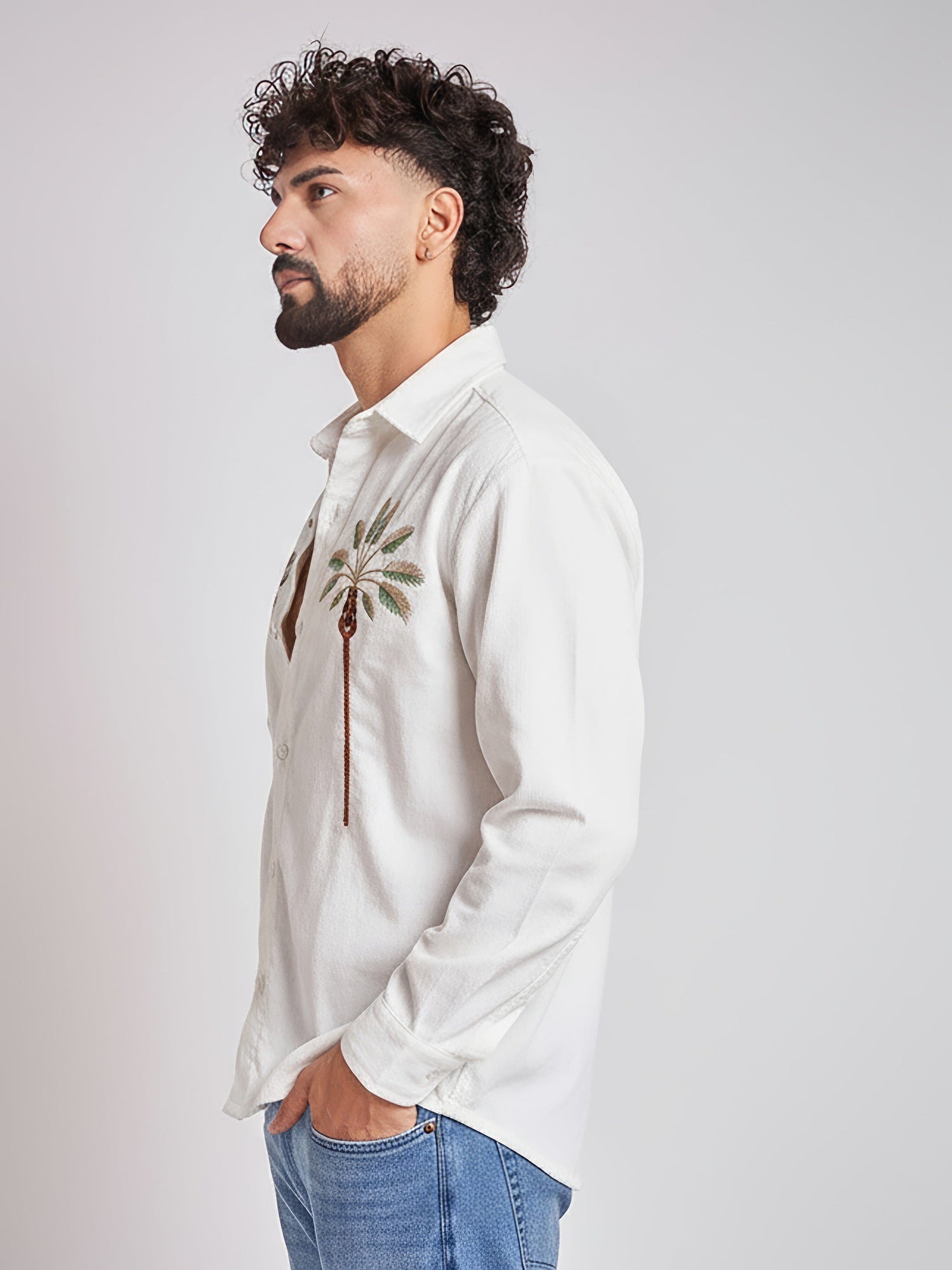 Expertly crafted from premium cotton corduroy shirting fabric, this shirt offers both durability and comfort. It features a classic spread collar and long sleeves, tailored for a regular fit that balances style with ease of movement. The front button closure allows for easy wear and adjustment, while the intricate palm embroidery adds a unique, refined detail that elevates the shirt’s aesthetic. Ideal for those seeking a blend of texture, subtle sophistication, and timeless design in their wardrobe.
