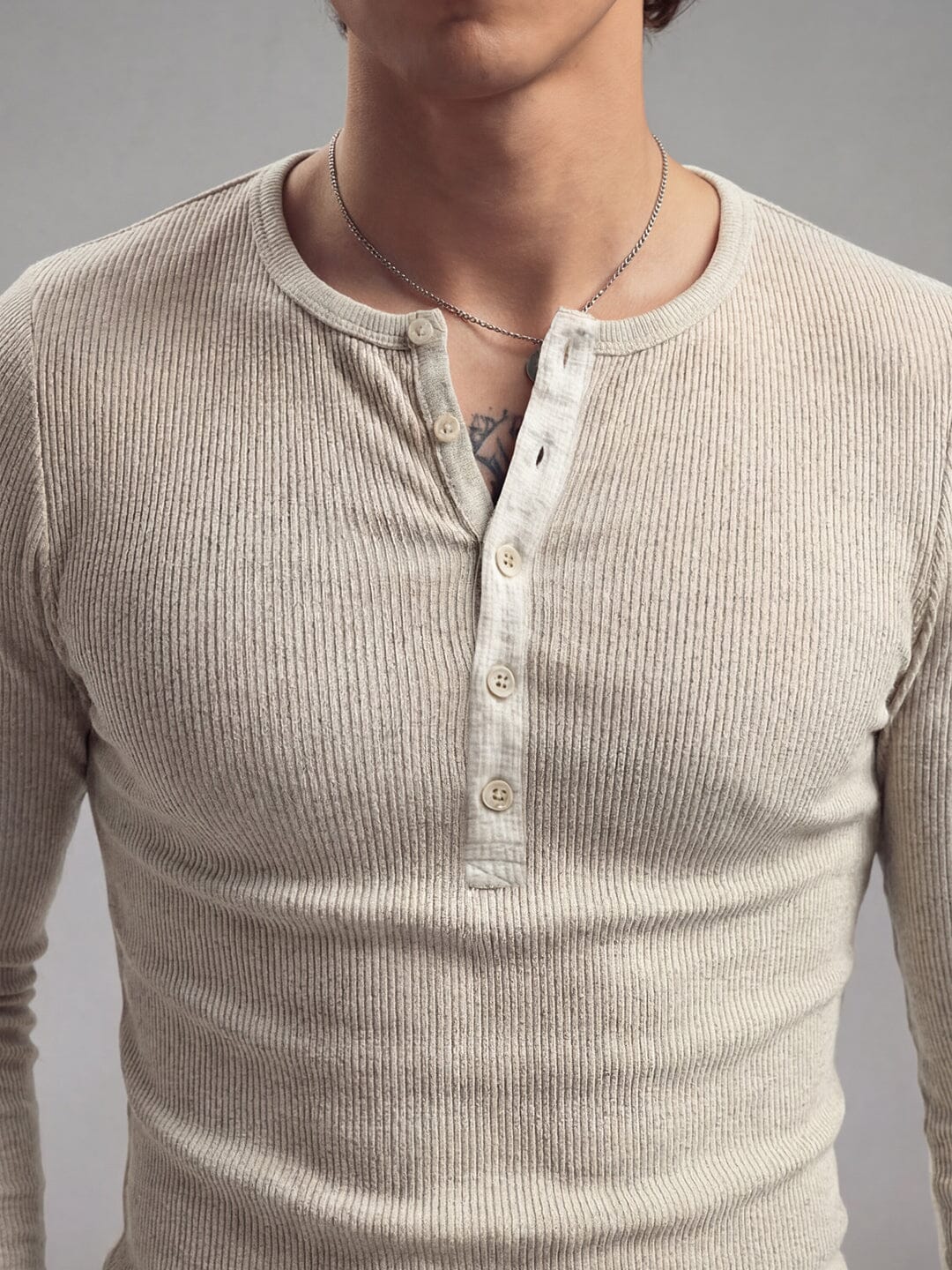 Elevate your casual wardrobe with this Beige Ribbed Henley featuring a classic crew neckline and long sleeves. The partial button placket adds versatile styling options, while the ribbed fabric delivers a structured look with comfortable stretch. Cut for a muscle-fit silhouette that flatters without restricting movement, this piece transitions seamlessly from layering to standalone wear.