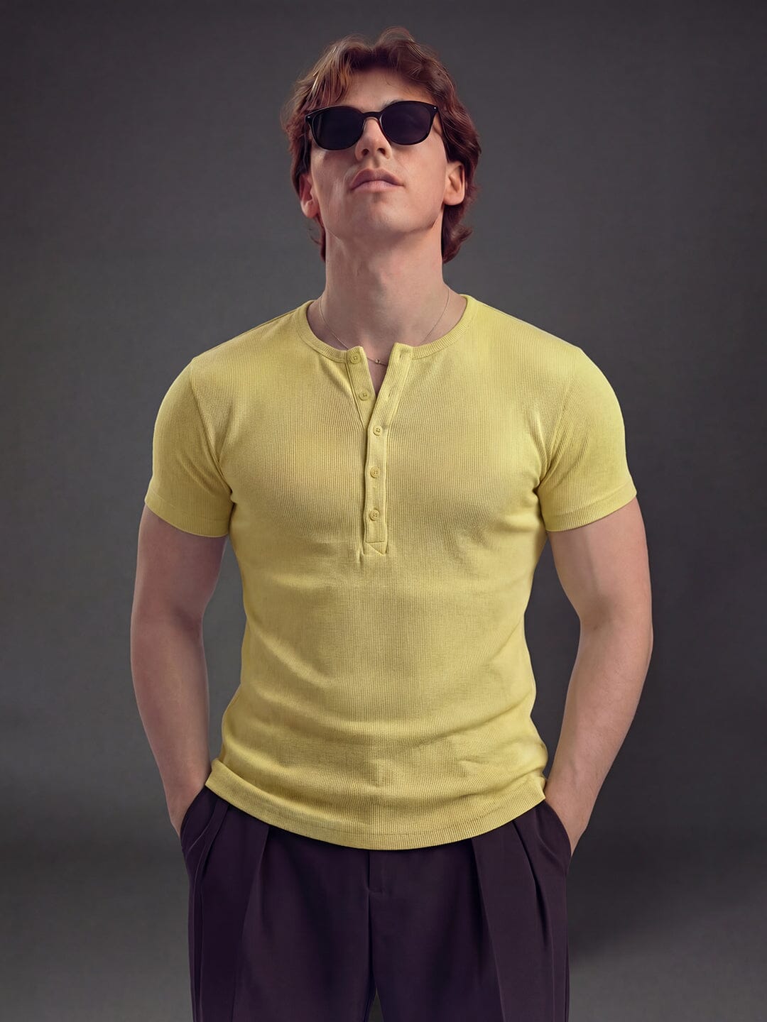 Elevate your casual wardrobe with this Lemon Ribbed Henley Short Sleeve Tshirt featuring a classic crew neckline and Short sleeves. The partial button placket adds versatile styling options, while the ribbed fabric delivers a structured look with comfortable stretch. Cut for a muscle-fit silhouette that flatters without restricting movement, this piece transitions seamlessly from layering to standalone wear.