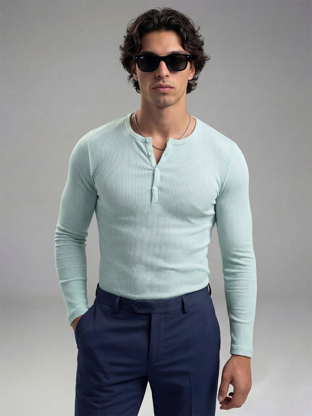 Elevate your casual wardrobe with this Mint Henley featuring a classic crew neckline and long sleeves. The partial button placket adds versatile styling options, while the ribbed fabric delivers a structured look with comfortable stretch. Cut for a muscle-fit silhouette that flatters without restricting movement, this piece transitions seamlessly from layering to standalone wear.