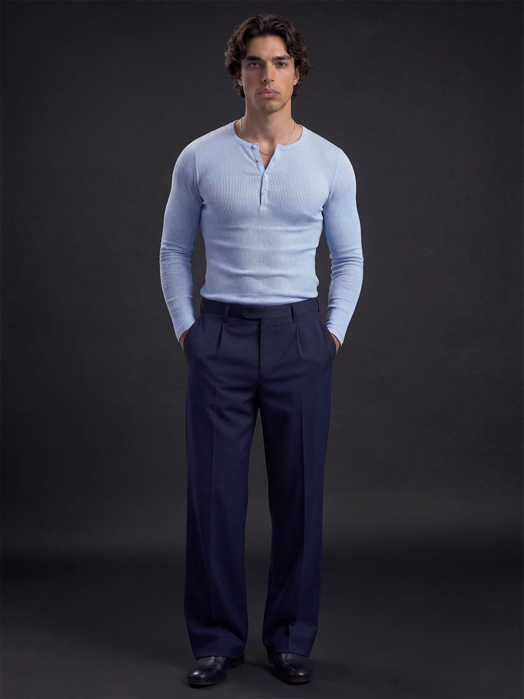 Elevate your casual wardrobe with this Sky Blue henley featuring a classic crew neckline and long sleeves. The partial button placket adds versatile styling options, while the ribbed fabric delivers a structured look with comfortable stretch. Cut for a muscle-fit silhouette that flatters without restricting movement, this piece transitions seamlessly from layering to standalone wear.