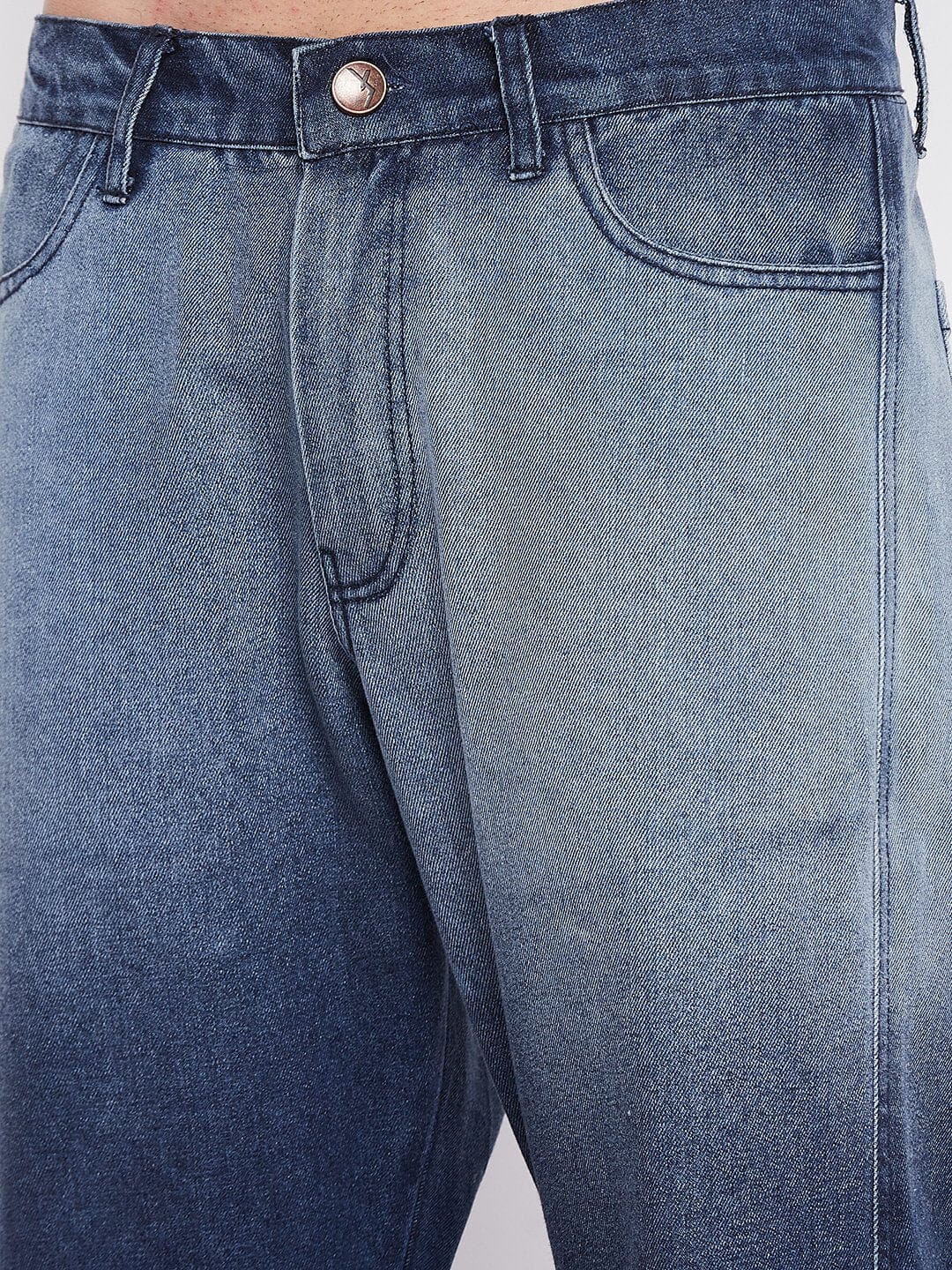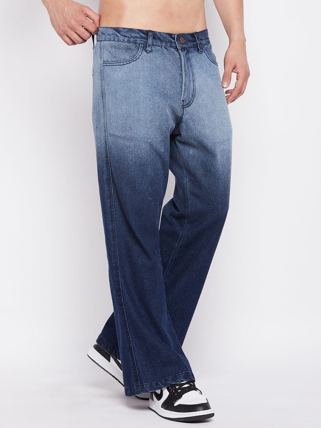 Blue Cotton Denim Flared Wide Legged Leg Opening,Ombre Washed baggy Oversized Fit,Zipped Fly and Buttoned Closure,With Belt loops.